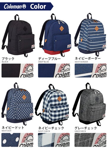ギフト対応 Details ■Brand Coleman コールマン ■Item C-DAYPACK2 リュックサック/バックパック ■Size 約32×43×17cm ■Color ・ブラック(2000021532) ・ディープブルー(2000021533) ・ネイビードット(2000021546) ・ネイビーボーダー(2000021540) ・ネイビーチェック(2000027118) ・グレーチェック(2000027119) ・ジグザグ(2000031133) ・スカイブルー(2000031134) ■重量 約410g前後 ■素材 ナイロン/ポリエステル ■Spec フロントファスナーポケット メイン収納(B4対応、内部に大きめスリーブポケット、オープンポケット×2) Comment コールマン C-SERIES ユニセックスに対応した豊富なカラーバリエーション♪