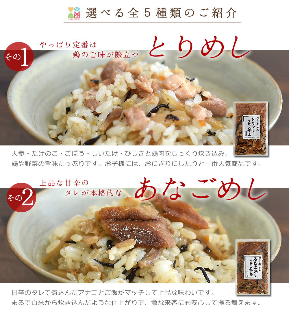 選べる商品内容 とりめし・あなごめし・ホタテめしチリメンめし・ふぐ明太子めし 原材料 商品ごとに内容が異なりますので詳細はコチラをご覧ください。